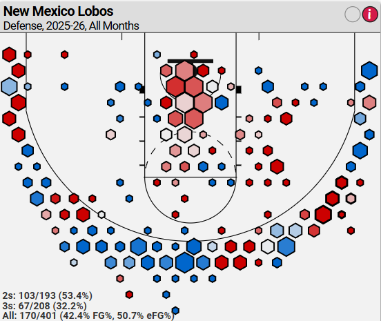 Graphic courtesy of Cbbanaltics.com The heat graph with red and blue hexagons show different areas on the floor where opposing teams have shot against UNM through 7 games. The hexagons marked in red show where teams are shooting over 40%.