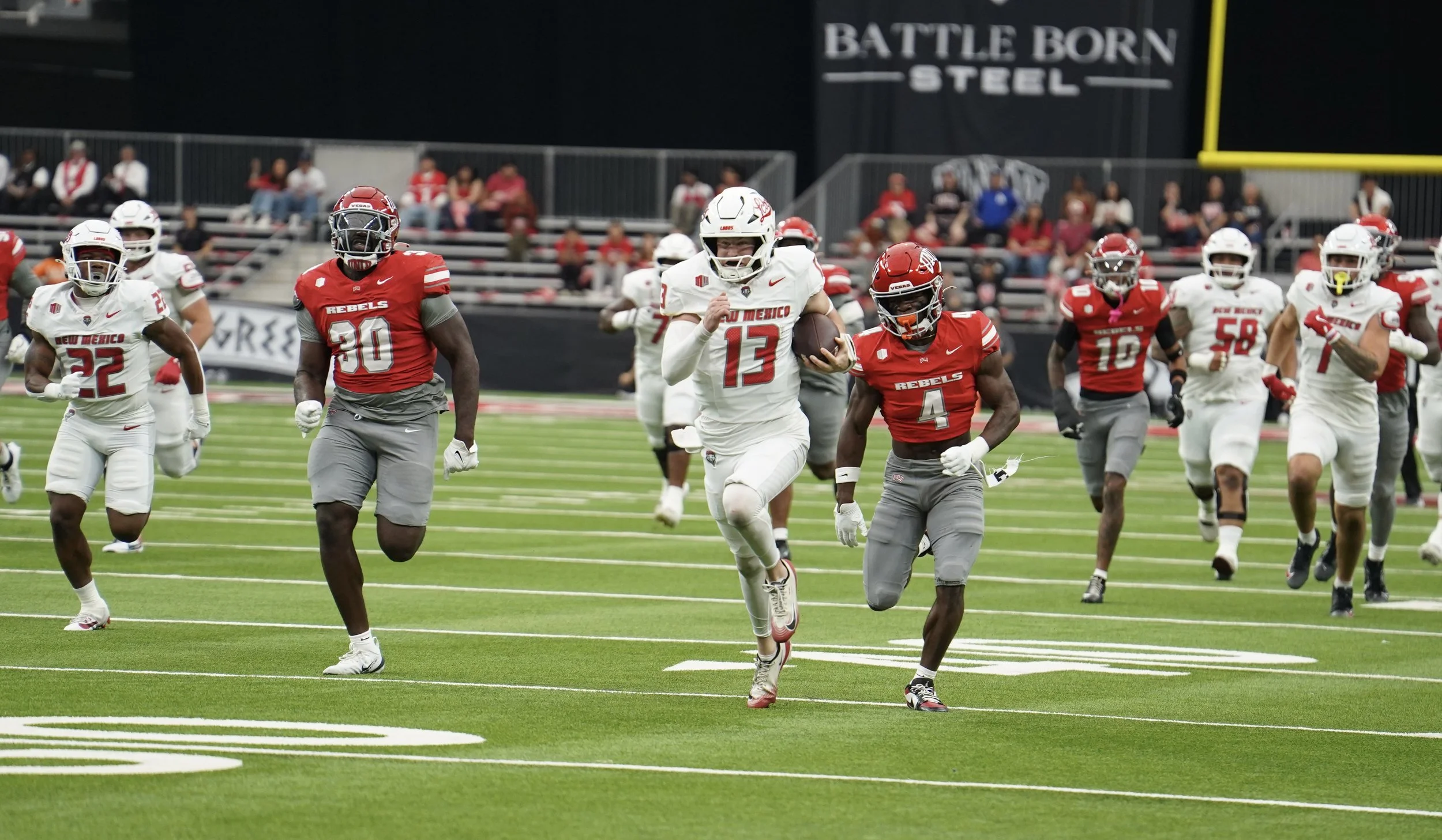 New Mexico quarterback, James Laubstein (#13) carries the ball against UNLV. Laubstein carried the ball eight times for 99 yards on Saturday, Nov. 11, 2025. Photo: Chris Rodarte/Game Pass Media