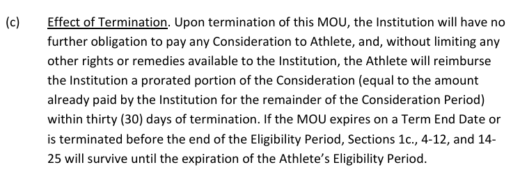 This termination clause states that if the contract is terminated, the college or university has no obligation to pay the athlete. However, the athlete may be required to repay some of their NIL compensation earned within 30 days. Do they really think a 19 year-old, (even with some basic financial literacy courses) will put their NIL earnings in trust and then later pay the university back if they breach the contract?